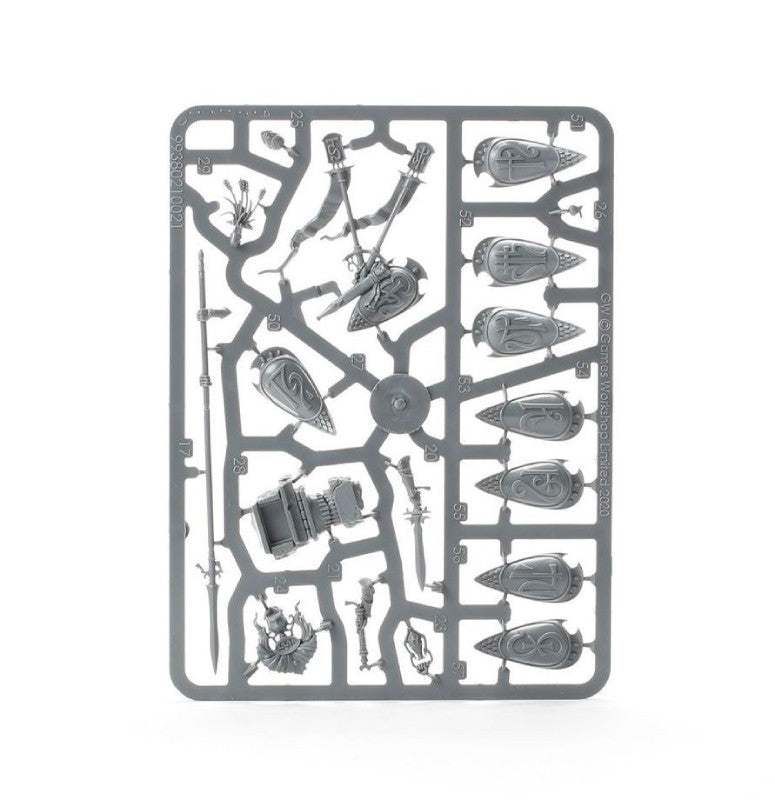 The Vanari Auralan Guardians include parts for up to two optional champions, one of whom can be used in play. Each has either a sword or a staff in hand, and there are two head options—one bare and one with helmet. There are six female heads (in three different styles) freely selectable for the four female bodies (in two different styles), and eight male heads (in four different styles) freely selectable for the six male bodies (in three different styles). The kit includes 20 shields (in ten different styles) that can be used across the unit as desired.